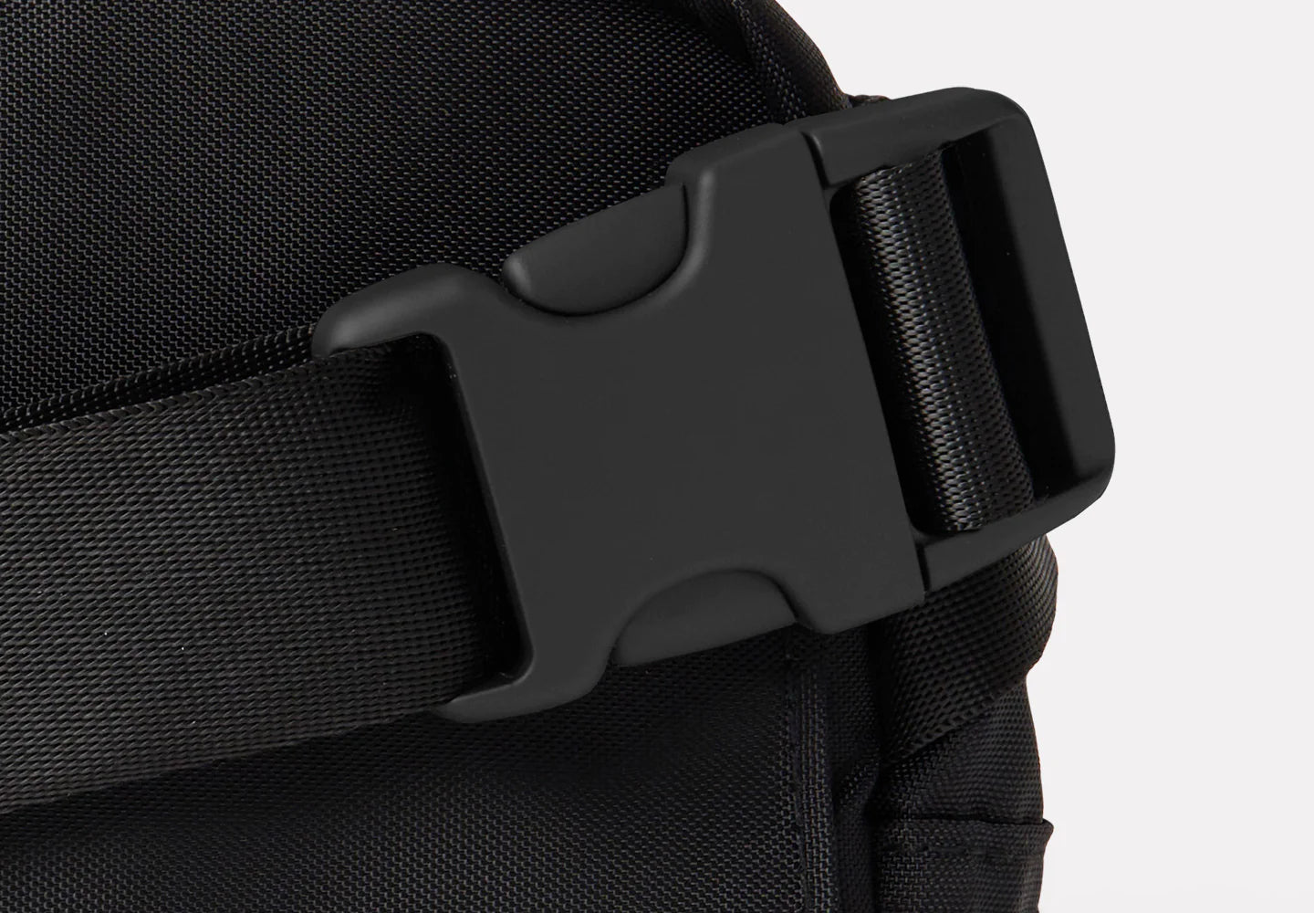 Crossbody shoulder strap with soft touch buckle for convenience and comfort.